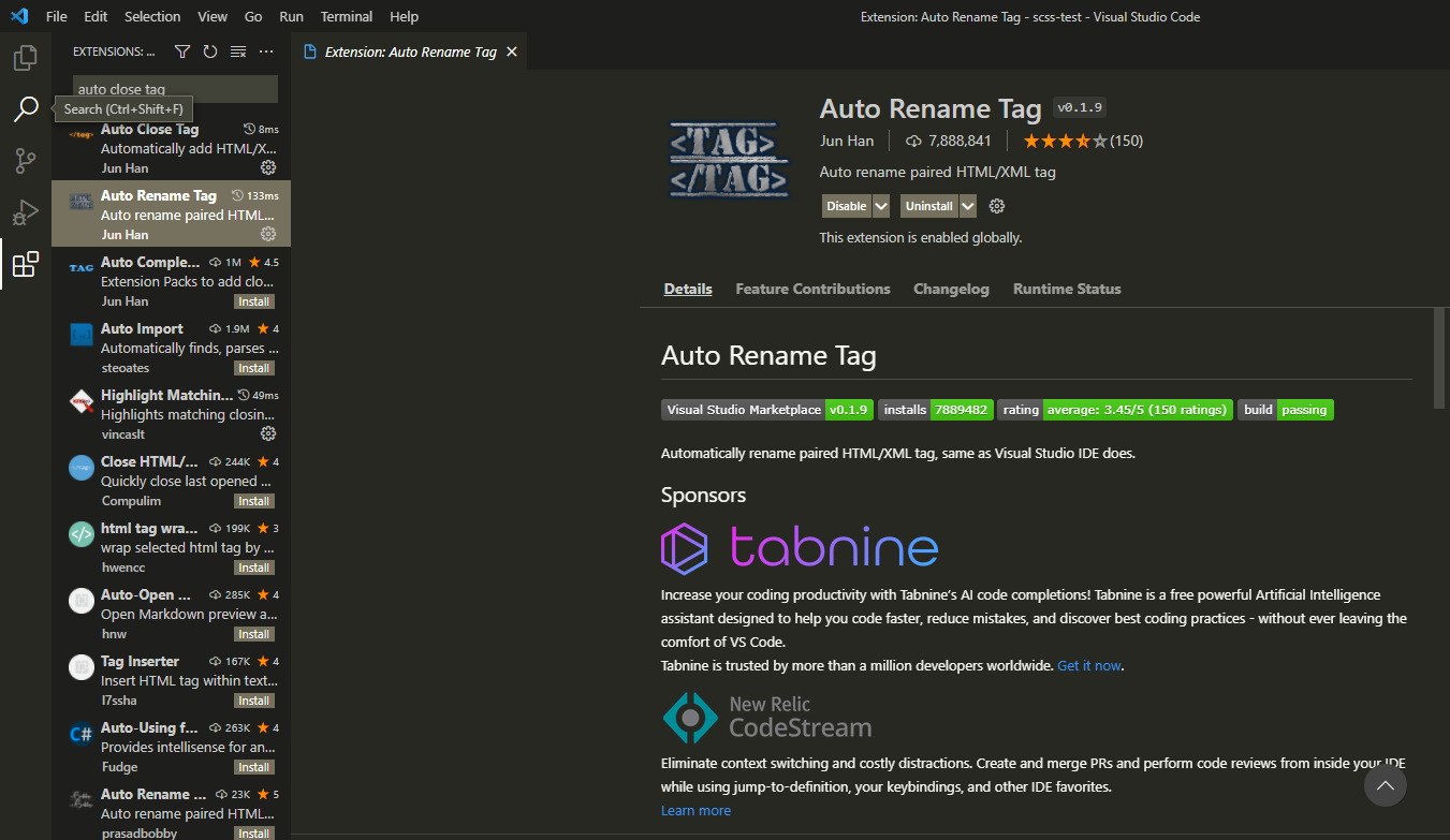 HTML/XML 태그의 닫힘 태그를 자동으로 완성해주는 기능이다. 태그 명을 수정할 때에도 닫힘 태그를 자동으로 수정해준다. 꼭 필요하고 없어서는 안 되는 기능이라고 생각한다. 정말정말!!!