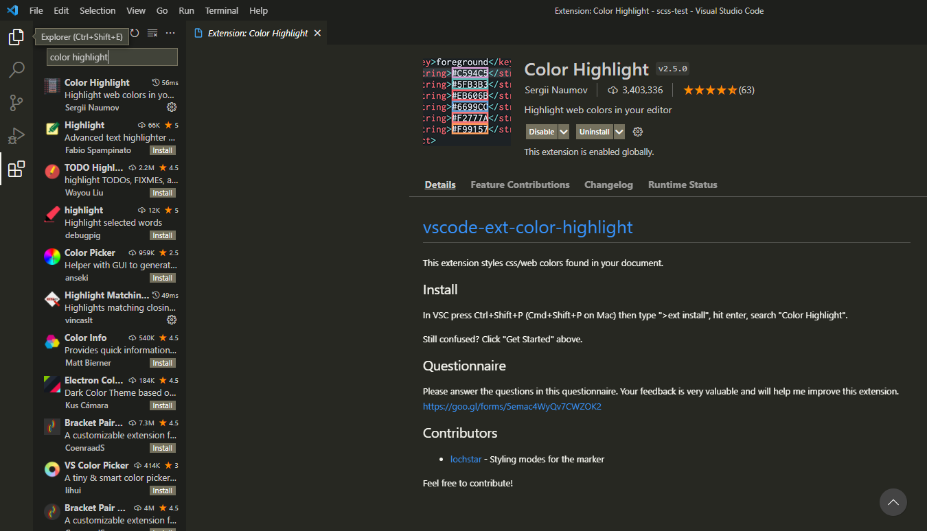 색을 많이 다루는 퍼블리셔나 프론트엔드 개발에게는 유용한 기능으로 코드로 작성된 색상을 가시적으로 보여주는 기능이다.