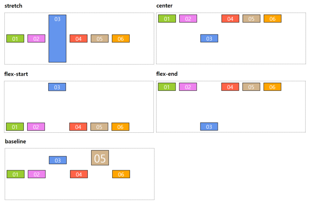 flex-start: 플렉스가 적용된 아이템들이 보조 축의 스타트 라인에 정렬된다.