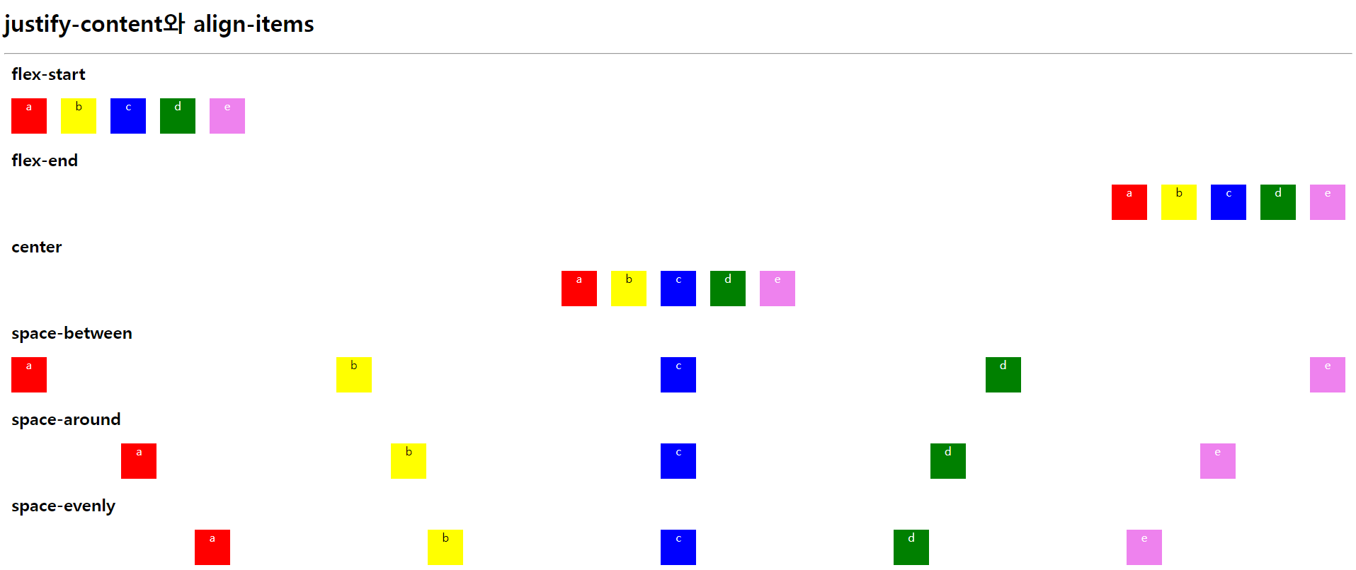 space-evenly: flex item들이 포함된 컨테이너의 전체 가로길이를 사용하며, 모든 flex item들이 동일한 양쪽 마진 값을 가진다.