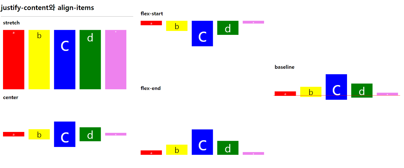 baseline: 플렉스가 적용된 아이템들의 베이스라인에 맞춰 정렬된다.