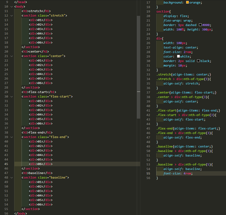 align-self는 align-items로 정렬된 아이템 중 어떤 한 개만 골라 개별적으로 컨트롤할 때 사용한다. align-items의 속성값들과 동일한 효과를 가진다. align-items는 컨테이너에 포함된 모든 아이템들의 정렬을, align-self는 한 개의 아이템을 개별적으로 정렬할 때 사용!