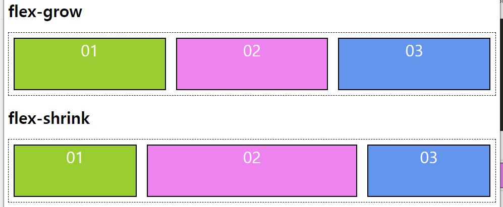 flex-grow와 flex-shrink 모두 기본 값은 1이며, flex-grow는 숫자가 커질 수록 크기도 커지고, flex-shrink는 숫자가 커질 수록 크기가 작아진다.